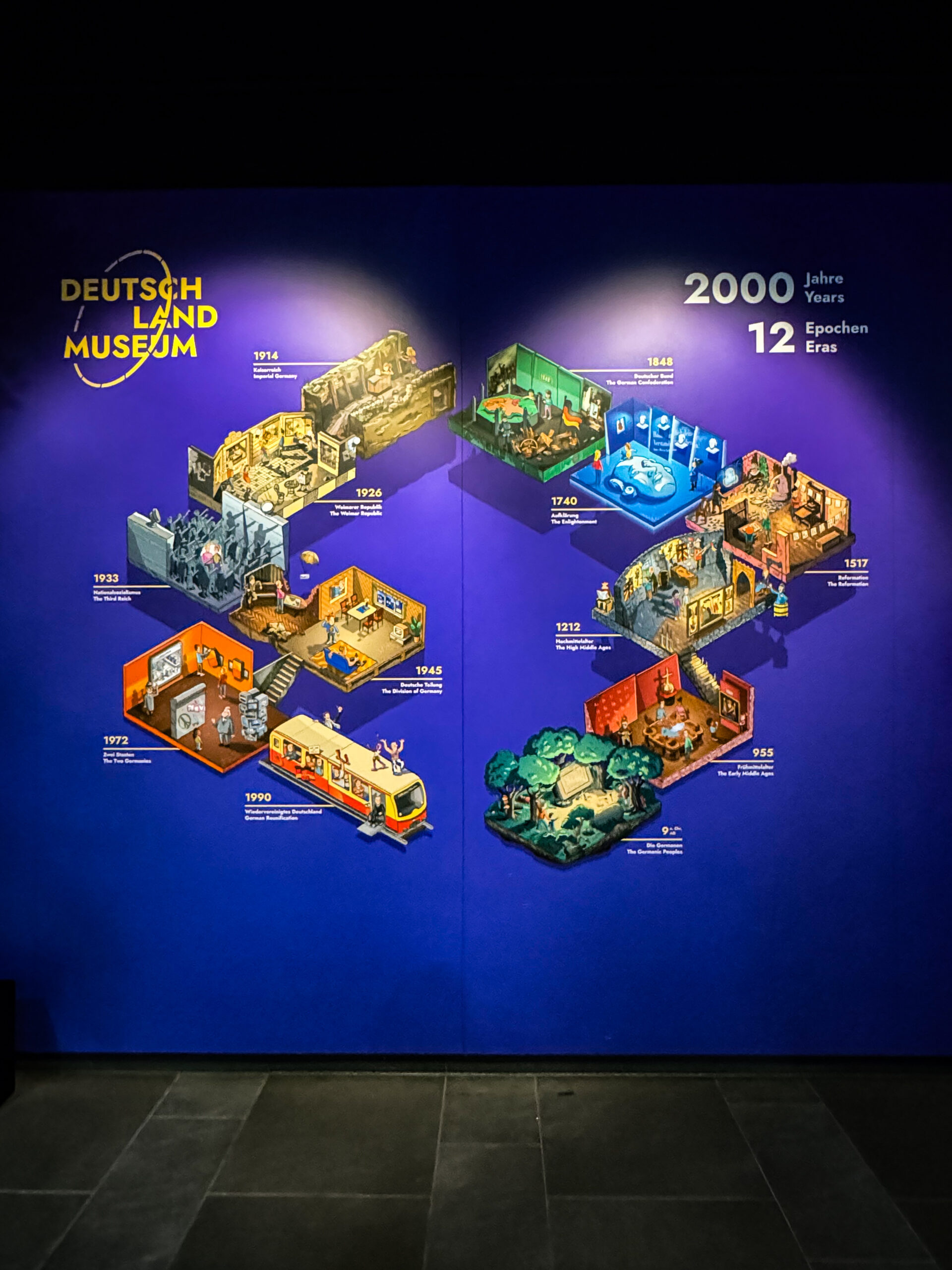 Całość tworzy opowieść o 2000 latach historii Niemiec, którą nie tylko ogląda się oczami, ale wręcz odczuwa wszystkimi zmysłami. Dzięki temu nawet osoby, które „nie przepadają za muzeami”, wychodzą z Deutschland Museum pod ogromnym wrażeniem. Jest to prawdziwa gratka dla osób kochających historię i chcących być jej częścią! Na miejscu możecie robić zdjęcia, nagrywać filmy i być częścią tej historii! Usiąść na kanapie niemieckiego domu i obejrzeć autentyczne reklamy dawnych czasów, „przygotować” posiłek w kuchni a także odwiesić płaszcz na wieszaku i ucałować żonkę po powrocie z pracy! 😁 Następnie wybrać się na zakupy do „lepszej strony Niemiec” i zobaczyć jak w czasach gdzie wschód żył w ubóstwie – po zachodniej części półki sklepowe uginały się od kolorowego wyboru produktów – od tych pierwszej potrzeby – po klocki Lego i zabawki o których dzieci zza muru mogły tylko pomarzyć.